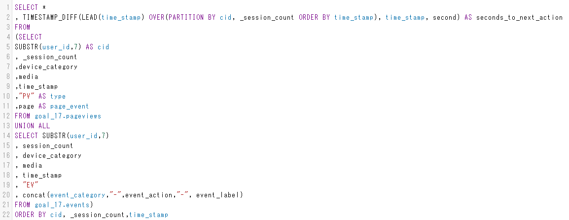 - ウインドウ関数で、次の行のタイムスタンプを取得し、自分の行との差分を秒で表すことで、次のアクションまでの秒数を取得しています(2行目)
