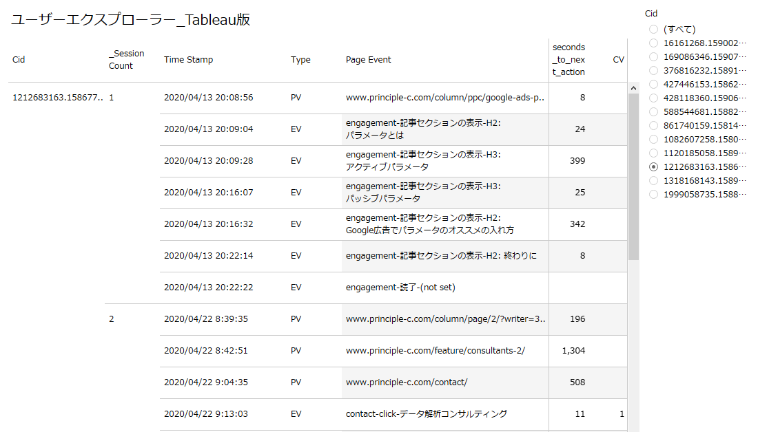 ページビューとイベントが時系列で並び、非常に何が起きたかを把握しやすくなっています。Tableauのクイックフィルタで異なったユーザーを表示するのも非常に簡単で、このあたりはTableauを使う価値があるといえます。