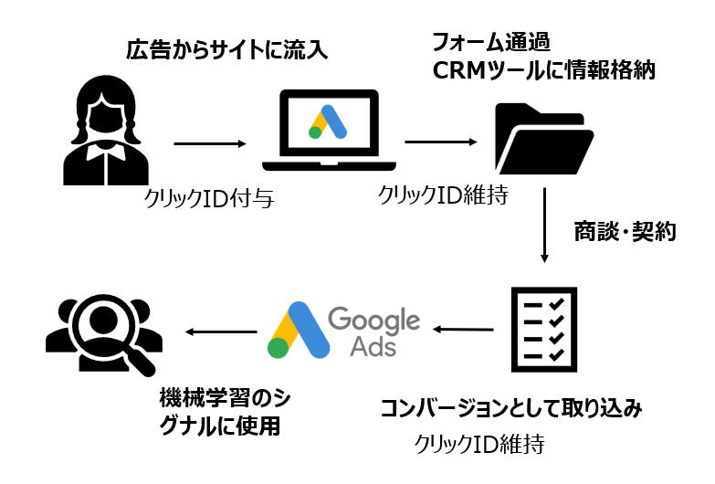 CRM上にある(広告経由で流入した)顧客データもコンバージョンとして、Google広告やYahoo広告などWEB広告に反映させることができます。