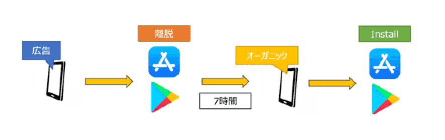 Case2: 広告クリック後、アプリストアへ遷移。一旦離脱し、7時間後にアプリストア内検索を行い、インストールをした場合