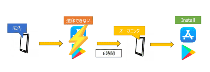 Case3: 広告クリック 後 、電波障害などの理由でアプリストアへ遷移できなかった。再度6時間以内にアプリストア内検索をしてインストールした場合