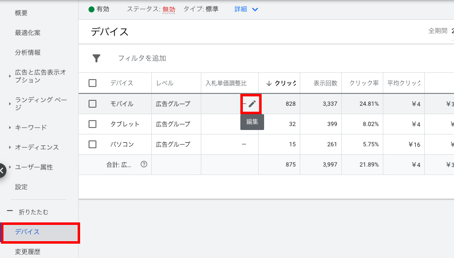 逆に明確なデータのない状態でデバイス別設定をしても「どのデバイスの効果が一番高いのか」というのはわからないので、意味がありません。まずは、自動入札である程度データを集めてからデバイス別設定に移りましょう。