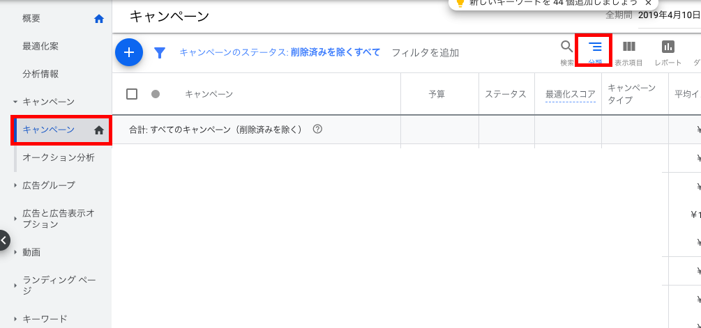 手順1.まずはGoogle広告の管理画面にアクセスして、キャンペーンをクリック。その後、右上にある「分類」をクリックしてください。