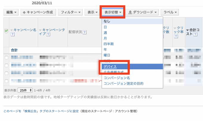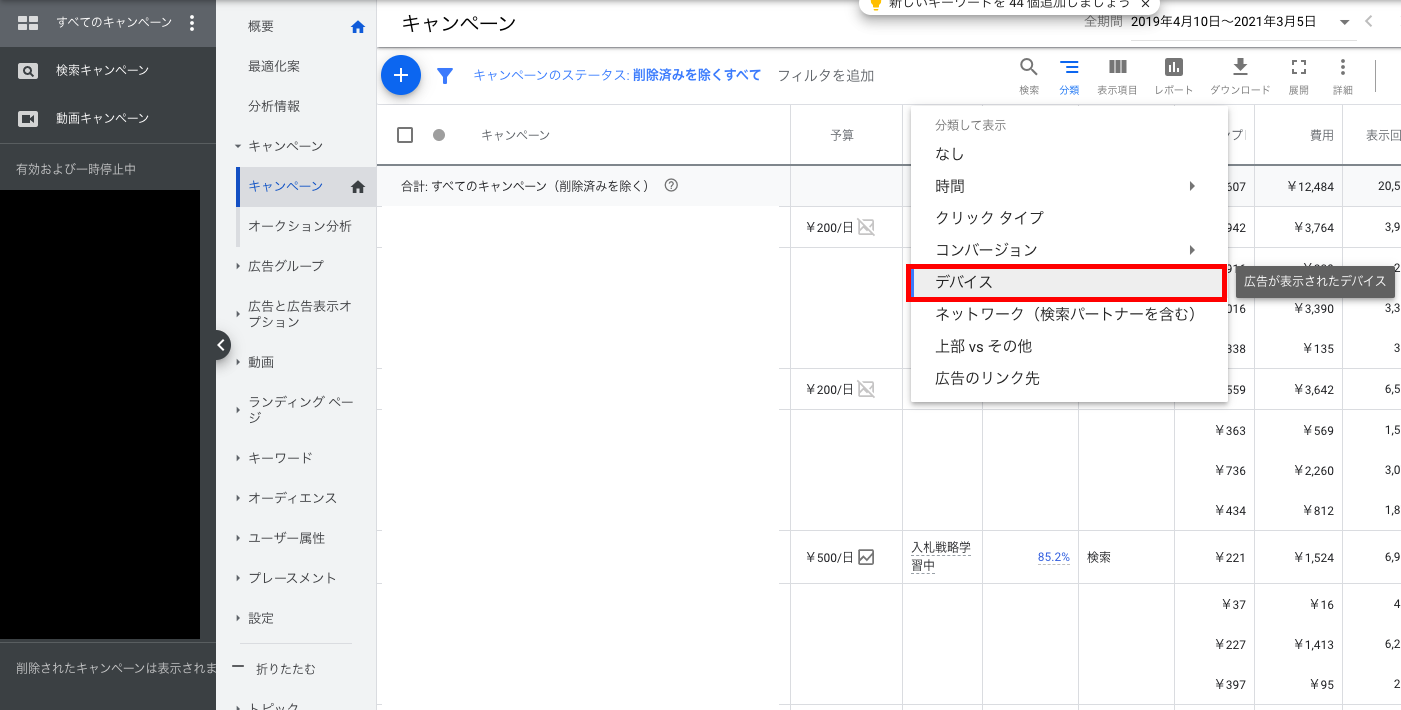 手順1.まずはGoogle広告のキャンペーンを開き、デバイスをクリックします。