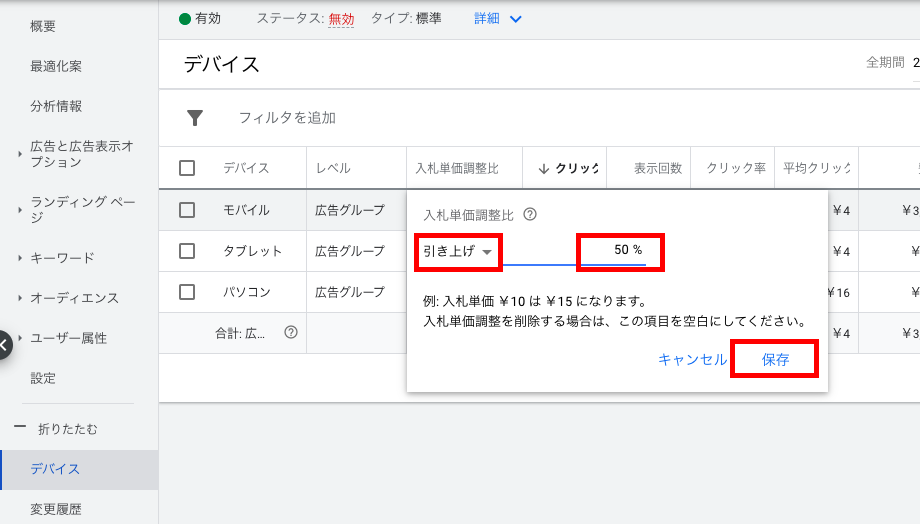 デバイス別の調整方法としては、+で引き上げ、−で引き下げになります。例として、入札単価100円のスマホデバイスの入札調整を行う場合、+50%変更した場合は、入札単価が150円になります。逆の場合は、50円です。