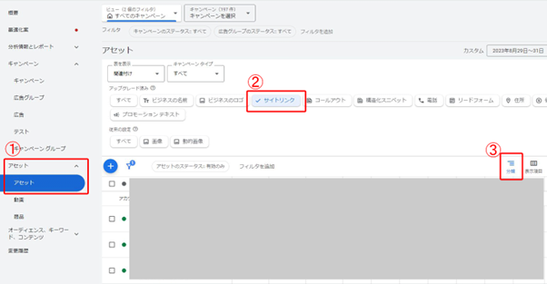 早速、サイトリンクの掲載結果を見ていきましょう。Google広告にログインし、