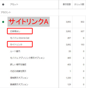 表示回数は、サイトリンクAが表示された数です。クリック数については、「サイトリンクAが表示された時に、広告がクリックされた数」を表しています。サイトリンクAがクリックされた数ではないので、ご注意ください。
