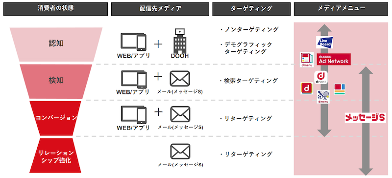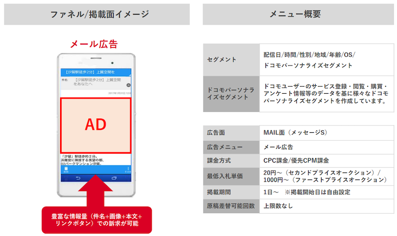 - メッセージS(予約型):ドコモ契約者にキャリアメールでの広告配信が可能