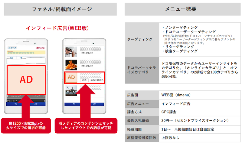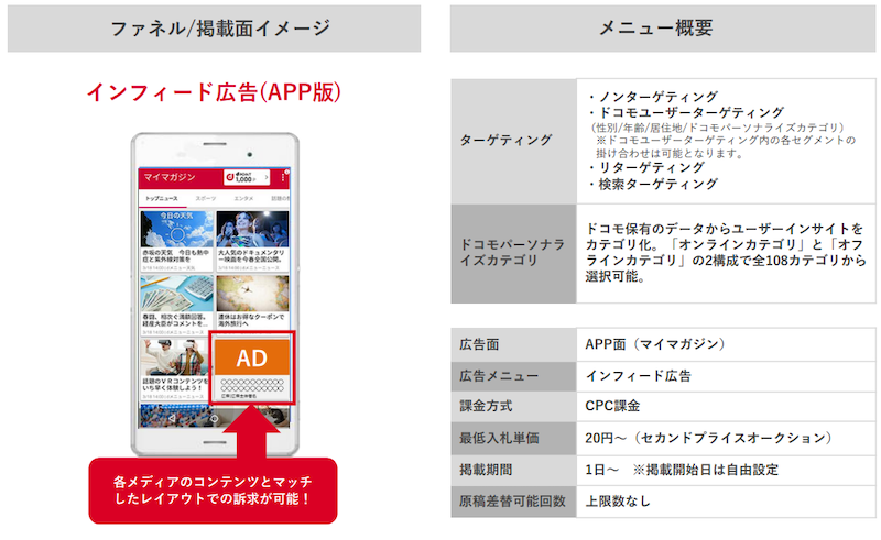 - docomo Ad Network(運用型):NTTドコモが運営するメディアへ掲載可能なアドネットワーク