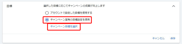 [キャンペーン固有の目標設定を使用]>[キャンペーン目標を選択]に遷移します。