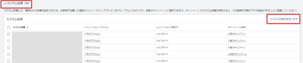 管理画面右上の[ツールと設定]>[コンバージョン]と選択し、下部のカスタム目標を表示し、[カスタム目標を追加します]をクリックします。