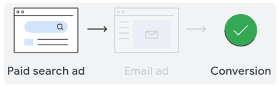 この経路では、ユーザーがPaid Searchの広告をクリックした後に、Email経由でコンバージョンしていますが、Google広告は有料チャネルであるPaid Searchの成果として評価します。Paid Search経由で流入した後、その他Google広告を除く複数チャネルからの流入をまたいでも、一定期間内にCVすれば、Google広告のロジックでPaid Searchに貢献度が割り振られるということです。
