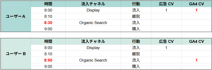 ユーザーAとユーザーBは同じく「ディスプレイ広告」と「オーガニック検索」を経由してコンバージョンに至っています。しかし、ユーザーAの行動は30分以内に行われたためGA4上では1セッションとしてカウントされます。