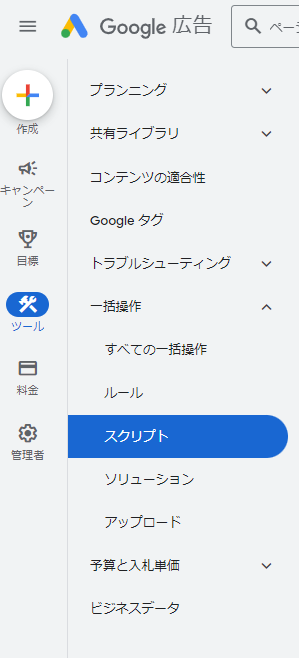 次に、先ほど決めた条件で商品を抽出するスクリプトを記述します。スクリプトはGoogle管理画面上の「一括操作」タブ内の「スクリプト」から作成できます。