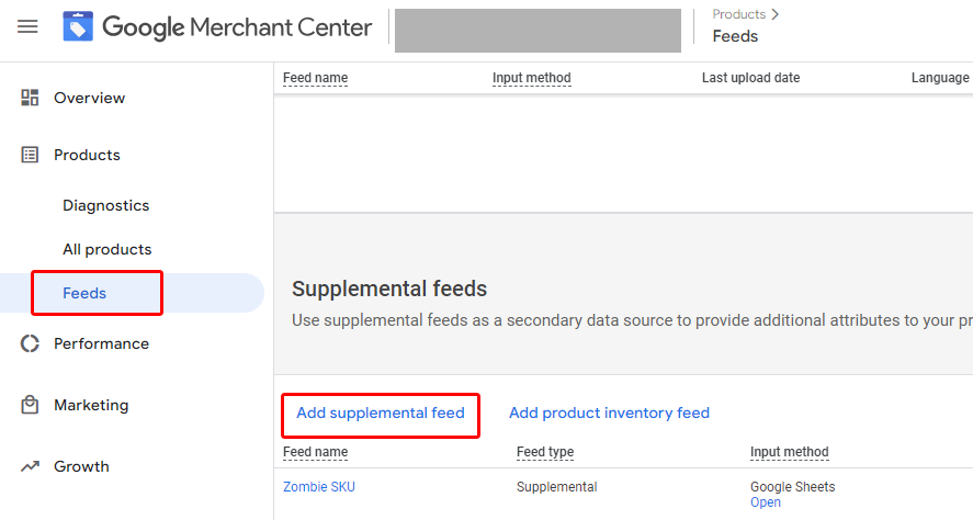 マーチャントセンターを開き、「Products」>「Feeds」>「Add supplemental feed」と押します。