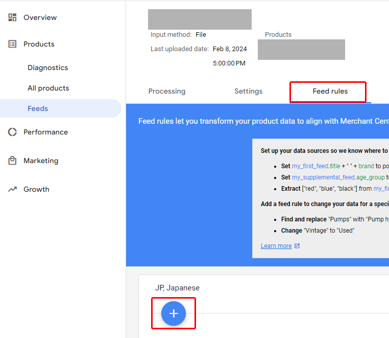 メインフィードを選択後、「Feed rules」に移動し、プラスボタンから任意の(現在使用していない)”custom label”を選択します。