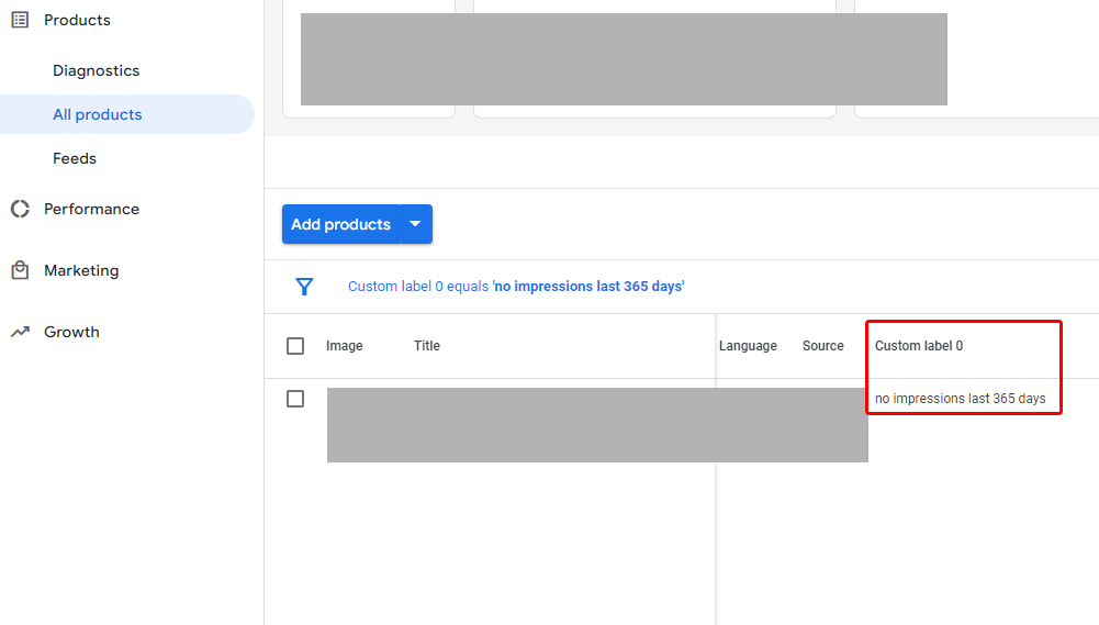 ここまで対応できたら、「All products」タブに移動し、実際にうまく設定できているか確認しましょう。該当のcustom labelに指定の値が入っていれば成功です。