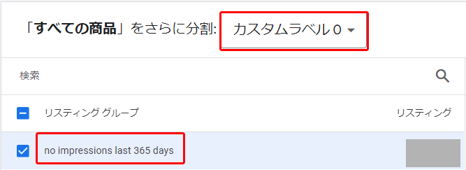 新規で作成したGoogle P-MAXキャンペーンにフィードを紐づけた上で、リスティンググループの編集画面から該当のcustom labelを選択し、「no impressions last 365 days」を選択します。
