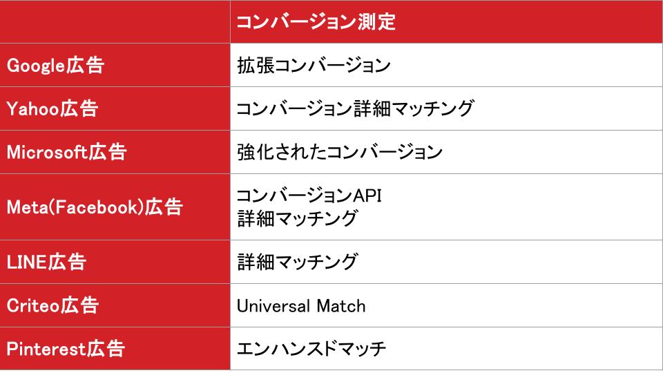 とくに、コンバージョン測定については、パフォーマンスに直結することもあり、この数年で多くの広告媒体社が導入したソリューションと言えます。下記は代表的な広告媒体社におけるコンバージョン測定のCookieレス・ソリューションです(広告媒体社ごとに名前は異なっていますが、実際の機能はどれも同じ)。
