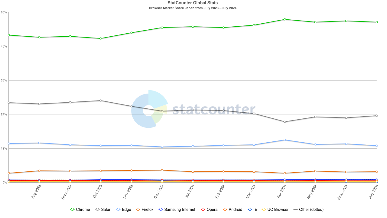 一方で、現在使われているブラウザはGoogle Chromeだけではありません。statcounterによると、日本のブラウザシェアは以下のようになっています。