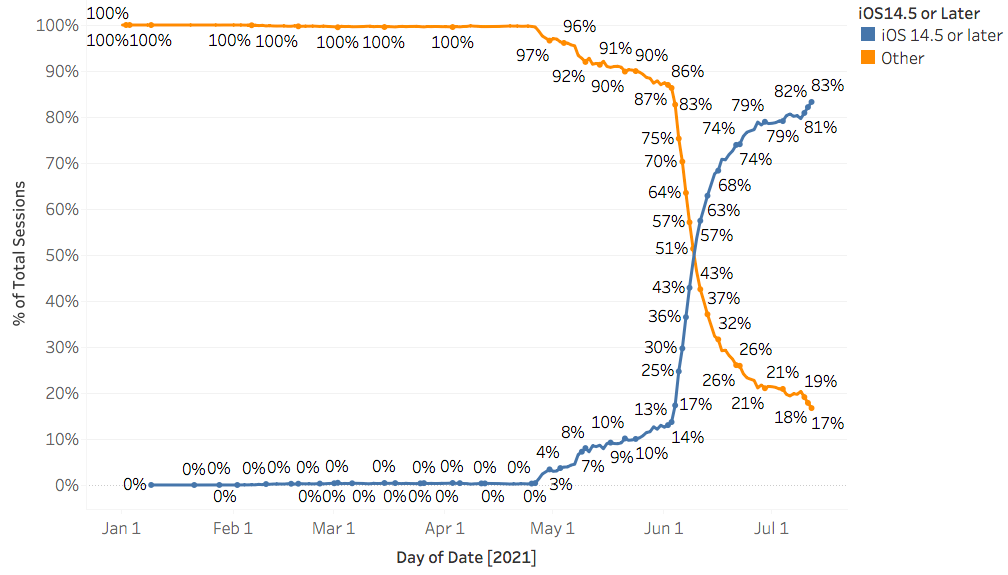 6月に入り、明らかにiOS14.5以降のユーザー数(青線)が急上昇していることが見て取れます。当記事の執筆時点(7月末)では、iOSユーザーのうち83%がiOS14.5となっています。