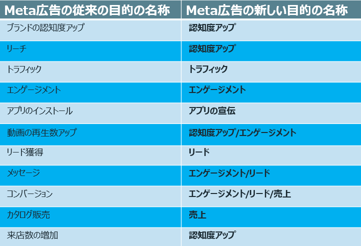 参照:Meta広告マネージャの目的のアップデートと変更 | Meta Business Help Center