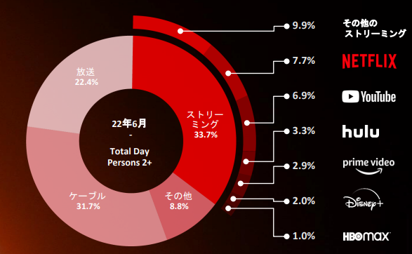 2022年6月時点でストリーミングの市場シェアは、ケーブル、放送を上回り33.7%となっています。そのうちNetflixは、Youtubeを上回る7.7%で推移しています。