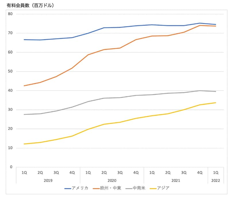 2019年から全世界で右肩上がりに有料ユーザー数を増やしていたNetflixですが、2022年に入り、アジアを除く地域(アメリカ・欧州・中東・中南米)では有料ユーザー数が減少傾向にあります。一方でアジアではここ3年間順調に有料ユーザー数を増やし、今後も成長基調が続くと見られています。
