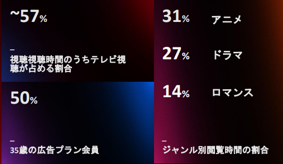 「視聴時間のうちテレビ視聴が占める割合」「35歳の広告プラン会員」「ジャンル別閲覧時間の割合」は図のとおりです。
