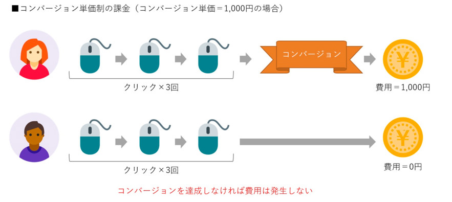 コンバージョン単価を 1,000円に設定し、1か月間に 10 回のコンバージョンが発生した場合、請求額は10,000円になります。1件のコンバージョンが達成するまでにクリックやインプレッションがどれだけ発生しても、コンバージョン単価の1,000円以外には料金は課金されません。