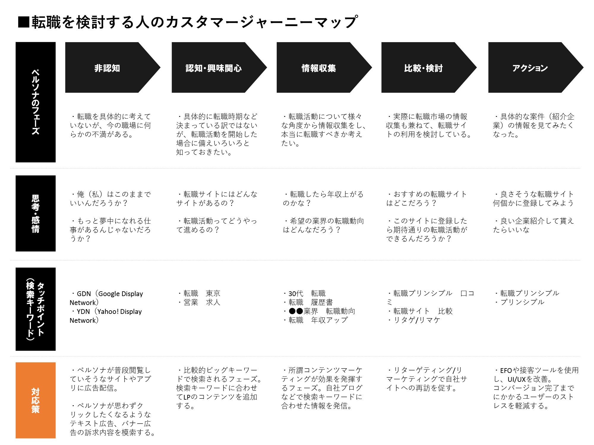 下記のカスタマージャーニーマップを例にとりながら、活用方法について解説します。