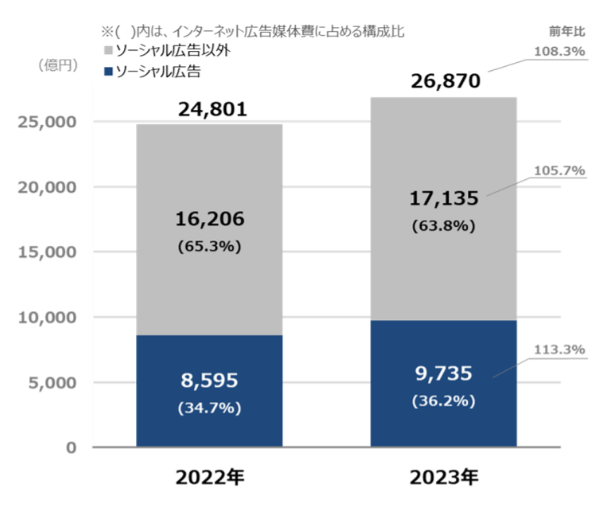 Web広告の出稿額は年々増加しています。その中でも、クリエイティブが成果を左右しやすいソーシャル広告についてはとくに増加幅が大きく、22年と比較すると23年は構成比で1.5ポイント増加(34.7%→36.2%)しています。