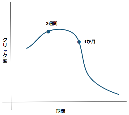 - 同じクリエイティブのみの配信ではクリック率の低下が起こる=クリエイティブの疲弊