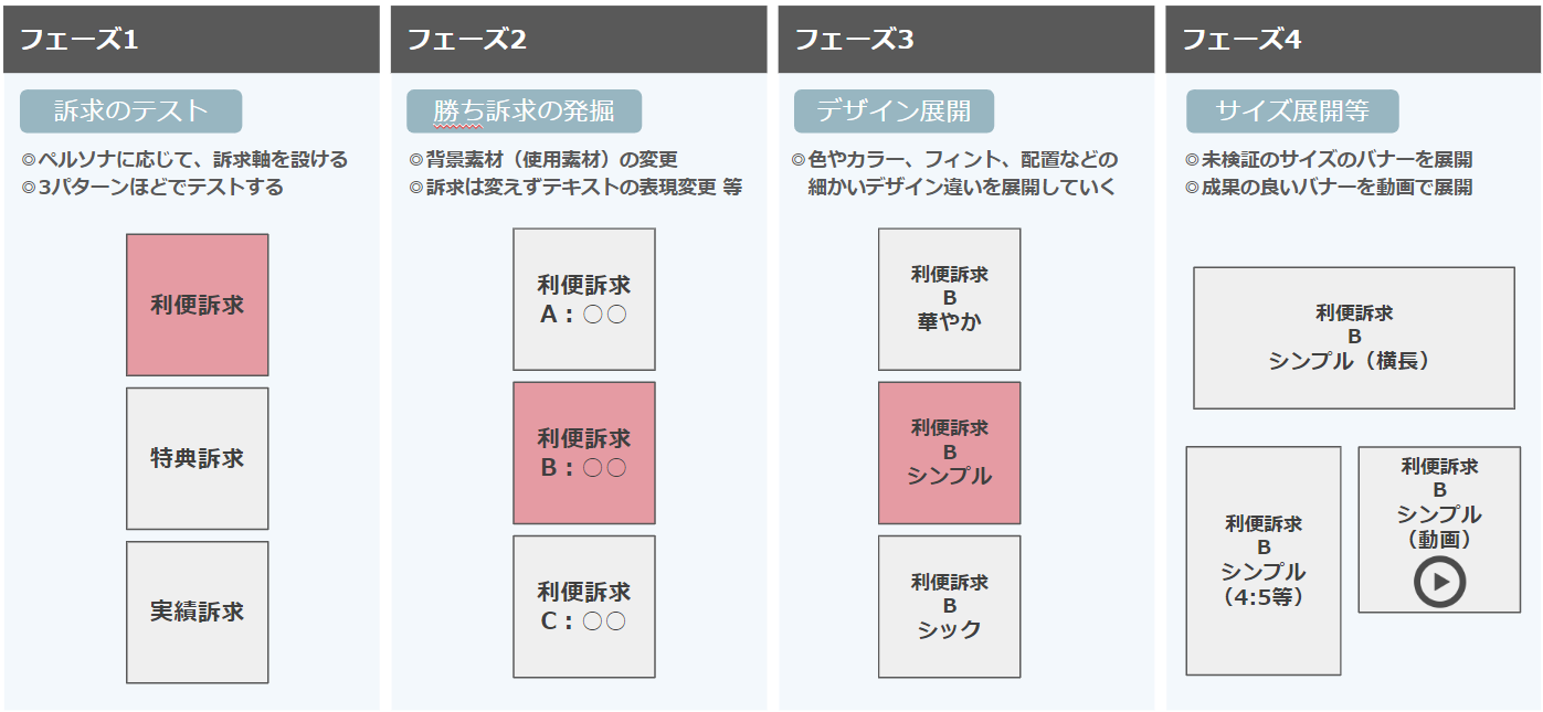 たとえば静止画のバナーであれば、訴求別のテストから始めます。その後、勝ち訴求について更新し、さらにデザインの展開を経て、サイズ別や動画の作成をすることで、クリエイティブの量産・検証を行なうことができます。