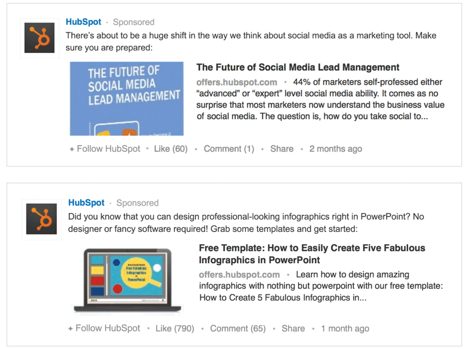 HubSpotは、中小企業のマーケティング担当者をターゲットにしたLinkedIn広告を打ち出しており、他のプラットフォームと比較して400%以上多いリードをもたらすと主張しています。