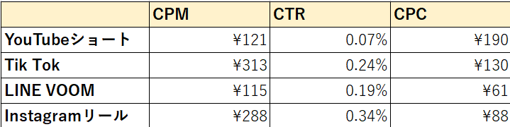 他媒体と比較した際のYouTubeショートの特長としては、CPMが低いことが挙げられます。一例としてTik Tokと比較をすると、2.5分の1程度のCPMで配信をすることが出来ています。