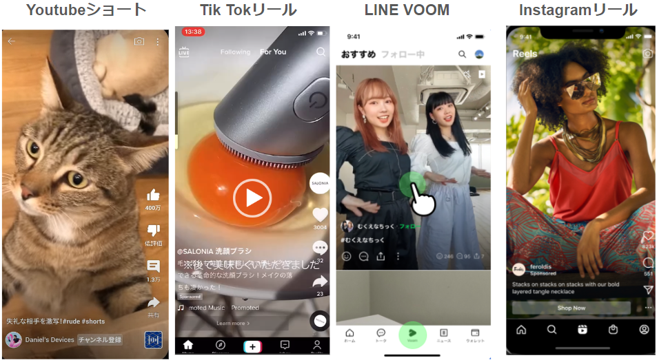 他のプラットフォームでは、Instagramリール、LINE VOOM、TikTokなどの縦型ショート動画などが同様に挙げられます。