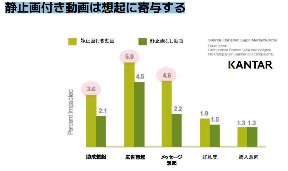 8. 下記グラフを参照すると、「静止画付き動画」と「静止画なし動画」を比較した際、想起段階で静止画付き動画の方が想起に寄与していることが分かります。特にメッセージ想起では静止画あり・なしで最も寄与度に差が出ています。