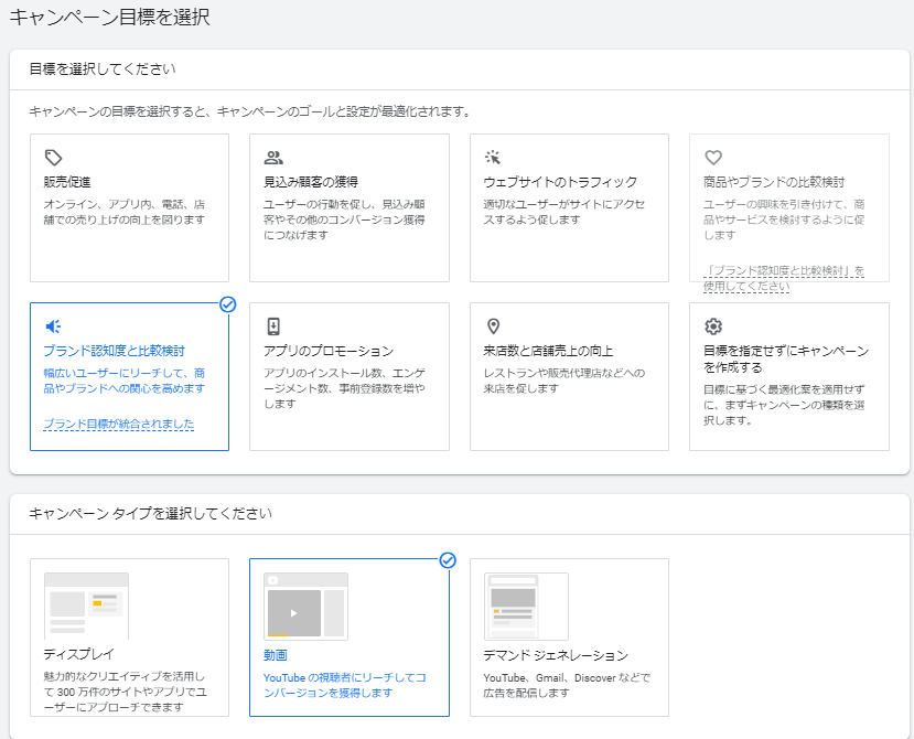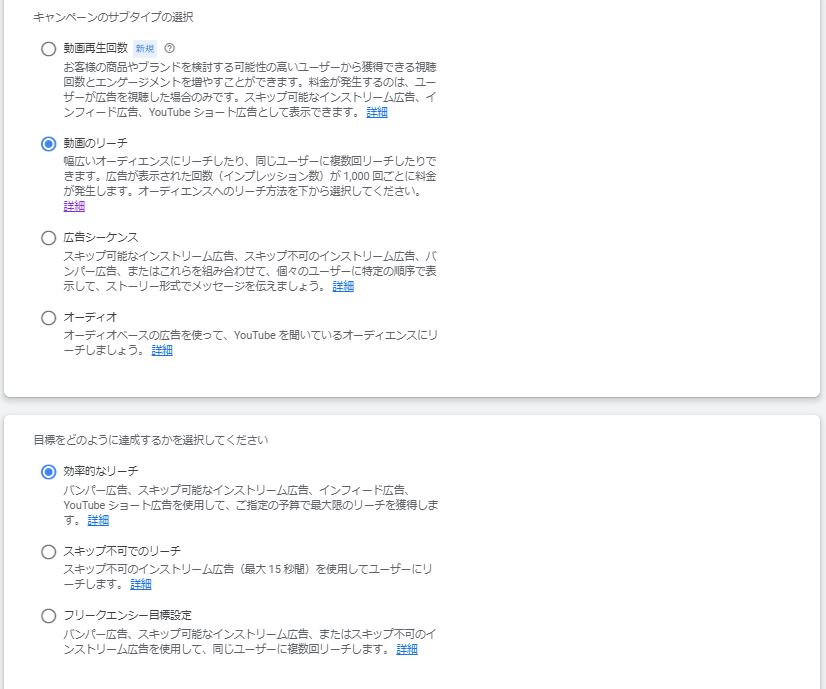 ※配信面を指定しての広告配信を行う場合、キャンペーン目的「ブランド認知度と比較検討」を選択→キャンペーンのサブタイプ「動画のリーチ」を選択→目標を「効率的なリーチ」に選択することで使用可能。(事前にVRC 2.0ホワイトリストの承認が必要)