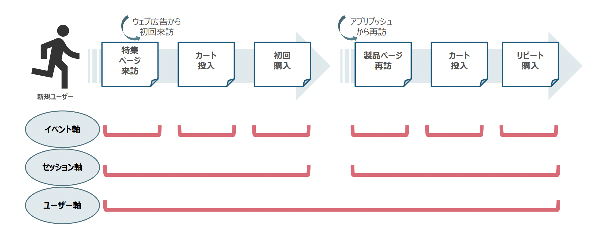 • イベント軸:最も細かい粒度で、ユーザーのサイト上での一つ一つの細かい行動に着目