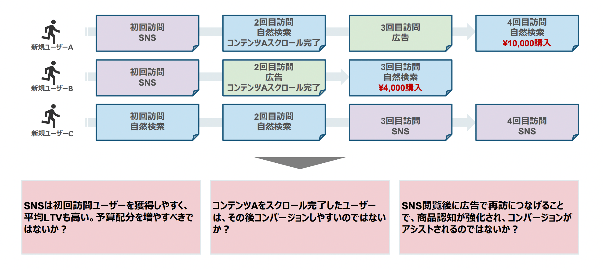 一方、GA4で追いかけていく「ユーザー軸」でデータを見るときは、ユーザーのジャーニー全体を捉えて、以下の図のように施策を評価します。