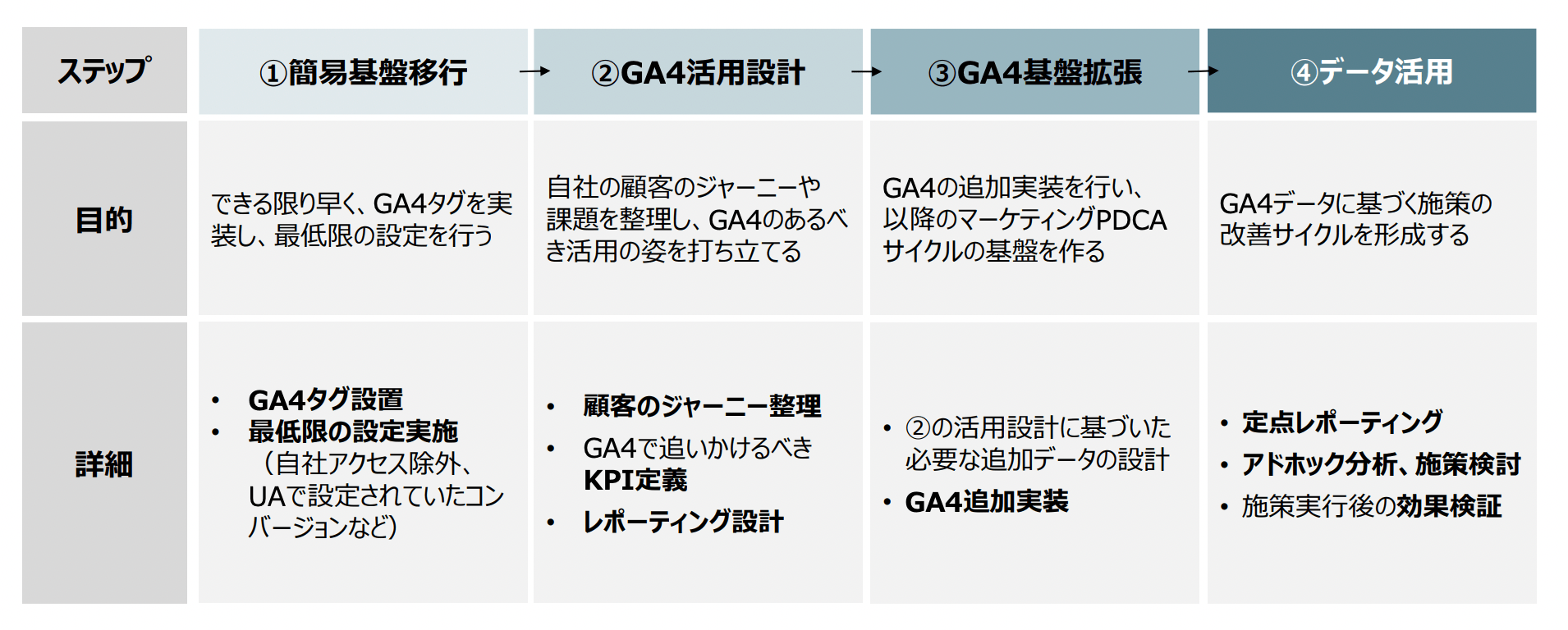 • ①簡易基盤移行:できる限り早く、GA4タグを実装し、最低限の設定を行う