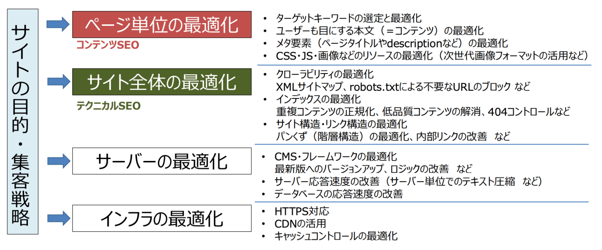 SEO(検索エンジン最適化)とは、各ページやサイト全体の構造から、サーバー要件・インフラ要件に至るまでを、サイト全体の目的や集客戦略に沿う形で最適化する行為であると捉えることができます。