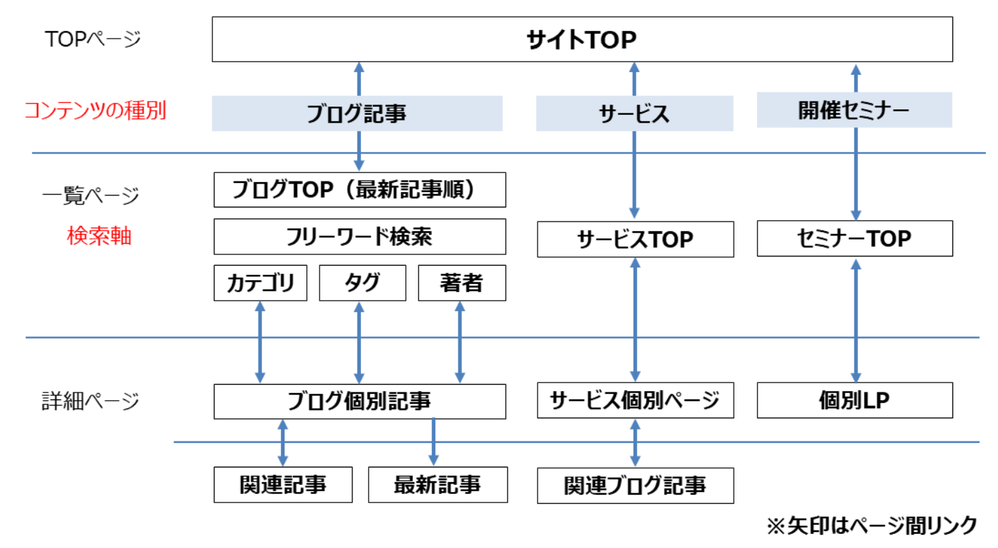 下記の図は、弊社コーポレートサイトのリニューアルの際に整理した、旧サイトを図式化したものです。弊社の旧コーポレートサイトでは、階層構造やリンク構造を図式化することで、セミナーの個別ページへの動線が弱い等の発見があり、本来あるべきリンクの発見などに役立てることができました。