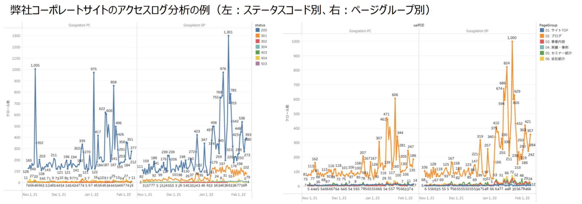 アクセスログを活用すると、日々のクロール数が集計できるだけでなく、ステータスコード別、ページグループ別にクロール状況が把握できます。また平均処理時間を取得すれば、時間がかかっているページの特定も可能です。