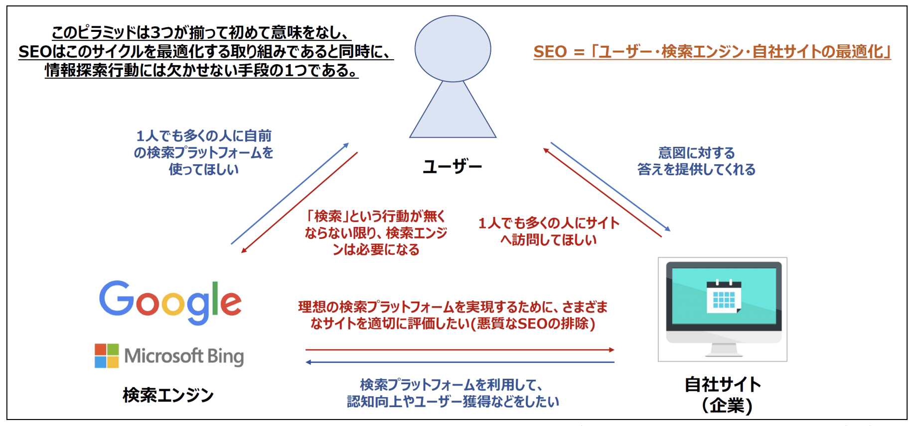 現在のSEOでは「検索エンジン上で自社サイトが上位表示されるための最適化」という意味を越えて、検索をする「ユーザー」、検索エンジン (検索サービス)、自社サイトの3者それぞれがwin-winとなるために、これら三者の関係を最適化することが重要であると考えます。