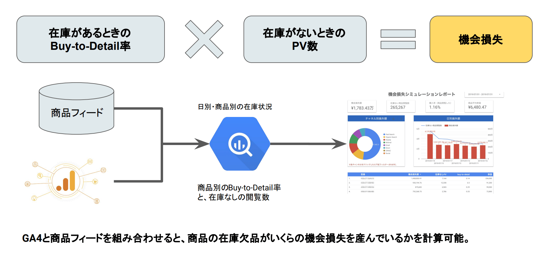 GA4では、商品別のBuy-to-Detail率(ある商品の詳細ページが閲覧された回数の内、購入される回数の割合)と、在庫がない時の詳細ページの閲覧数を得ることができます。これらを、Google Merchant Centerの日別・商品別の在庫状況のデータと組み合わせて、商品の在庫欠品がいくらの機会損失を産んでいるかを計算することが可能となります。