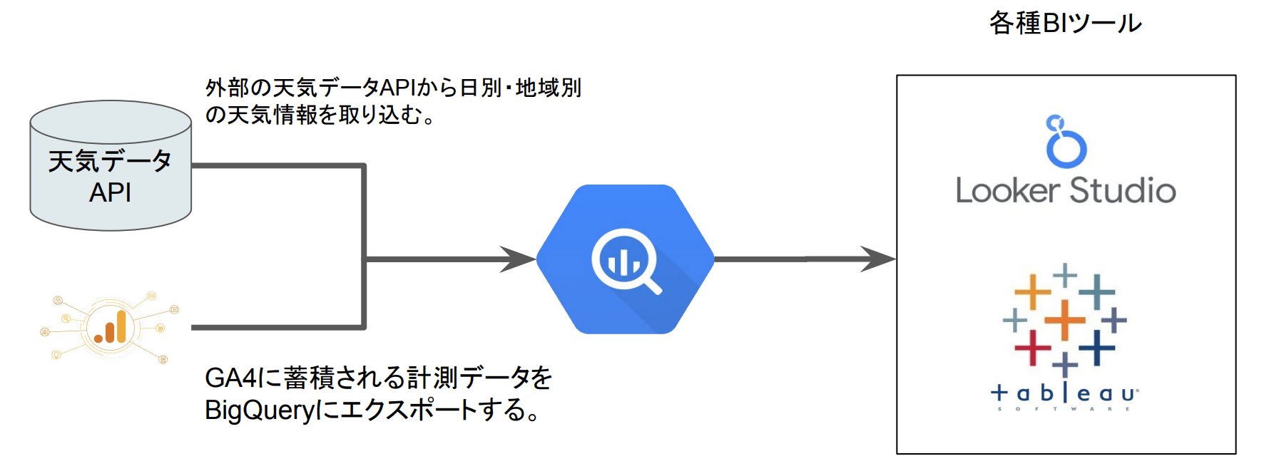 外部の天気データAPIから日別・地域別の天気情報を取り込み、さらにGA4に蓄積される計測データをBigQueryにエクスポートします。この2つのデータをBigQuery上で統合することで、天気や気温によるCVRの違いをBIツール上で分析することが可能となります。