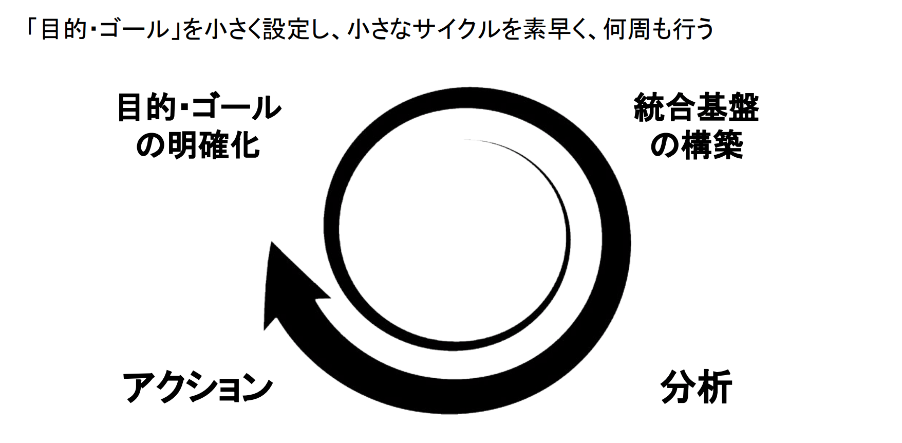 「目的・ゴール」を小さく設定し、小さなサイクルを素早く、何周も行います。プロセスの流れとしては、一般的なもの(目的・ゴールの明確化→統合基盤の構築→分析→アクション)と同様ですが、全体のサイクルを短期間で何度も行うことが可能となります。