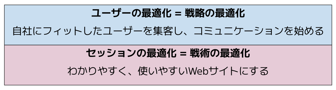 セッションの最適化は「戦術面の最適化」として当然行い、その上で、「戦略面の最適化」としてユーザーの最適化を行うという二階建てだと考えるのが良いでしょう。